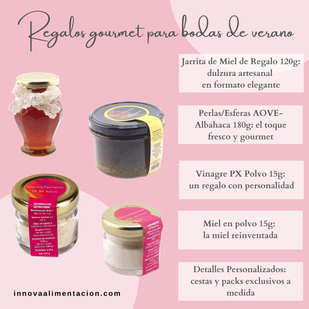 El verano es sinónimo de celebraciones al aire libre, momentos luminosos y sabores que evocan frescura y naturalidad. Si estás organizando una boda para esta temporada, elegir regalos gourmet para tus invitados puede ser la clave para dejar una impresión inolvidable. En Innovaalimentación, contamos con una cuidada selección de productos gourmet que combinan calidad, innovación […]